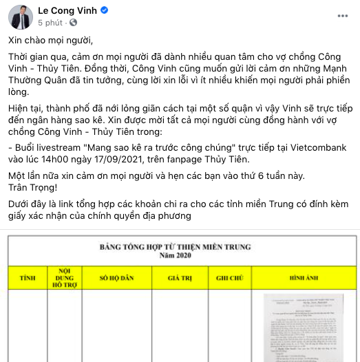 Cách đây vài phút, Công Vinh đã có bài đăng chính thức trên trang cá nhân liên quan tới lời hẹn "livestream" sao kê.
