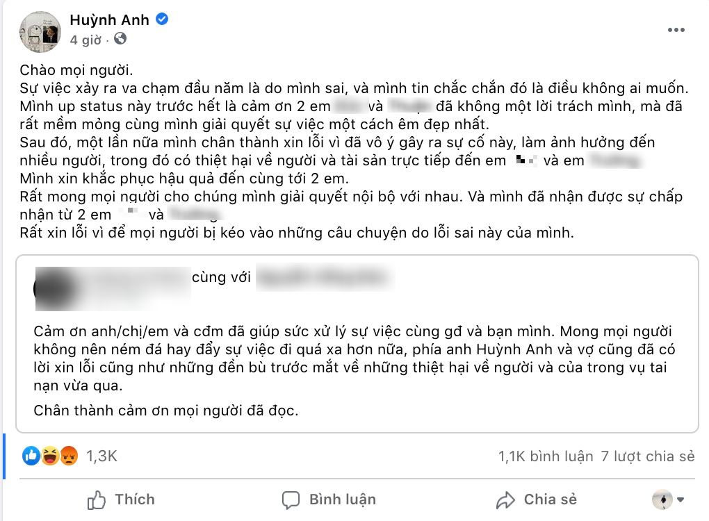 Theo đó cách đây ít giờ, sau khi vấp phải làn sóng phẫn nộ từ dân mạng nam diễn viên buộc phải lên tiếng xin lỗi. Trên Fanpage chính thức, Huỳnh Anh viết: 'Sự việc xảy ra va chạm đầu năm là do mình sai, và mình tin chắc chắn đó là điều không ai muốn... Mình xin khắc phục hậu quả đến cùng tới 2 em.