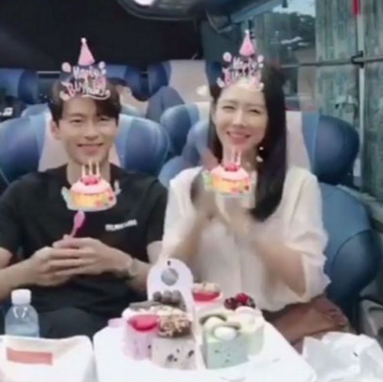 Son Ye Jin tự tin nói: "Chúng tôi chúc mừng bằng bánh sinh nhật fan tặng anh ấy. Còn anh ấy thì chấp nhật làm hành động dễ thương cùng tôi".