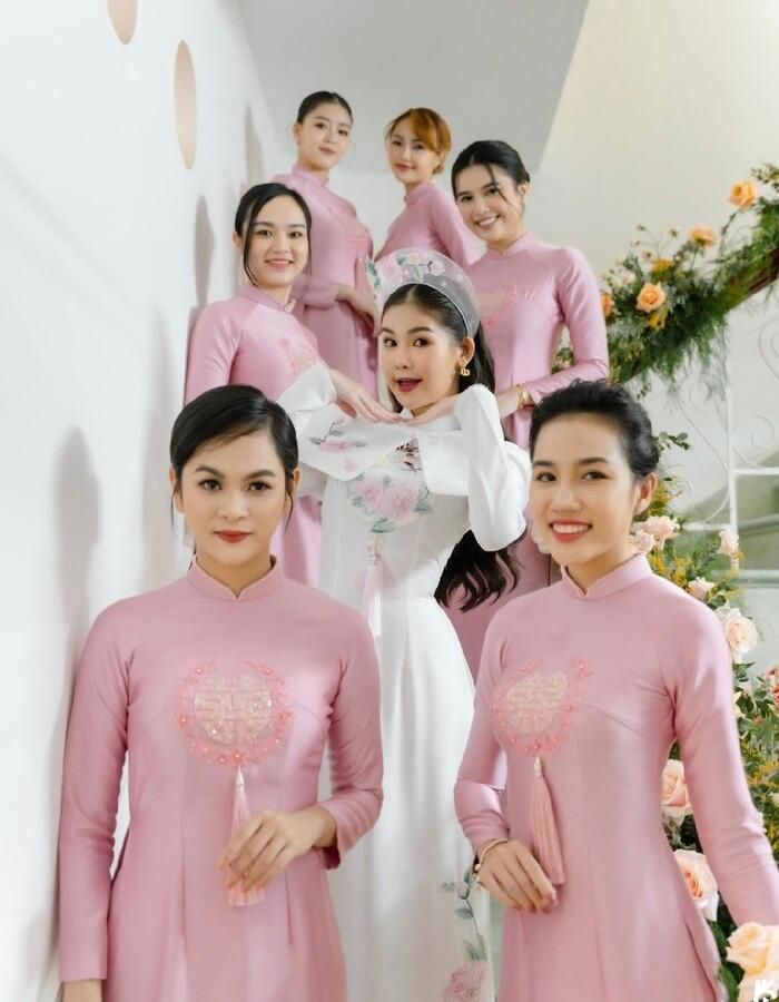 Dàn mỹ nhân bê tráp nhà gái diện trang phục với tone màu hồng làm chủ đạo. Ở đầu cổng, tên cô dâu - chú rể được in nổi trên nền giấy màu trắng. Bên cạnh đó, trước cửa còn trưng bày nhiều hoa khiến buổi lễ diễn ra đầy trang trọng.