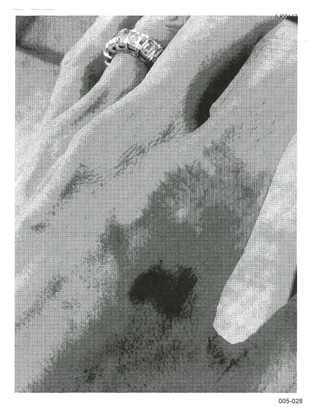 Mới đây, bản in đen trắng những bức ảnh được cho là chụp thương tích của Angelina trong vụ việc được truyền thông quốc tế chia sẻ. Trong đó, một bức ảnh về vết đỏ trên mu bàn tay và một bức khác về vết thương ở khuỷu tay.