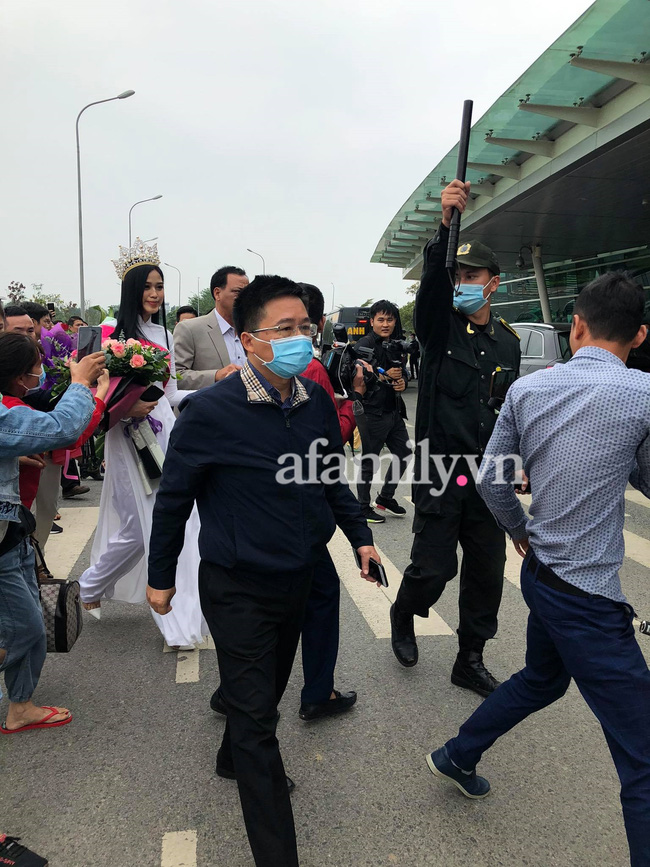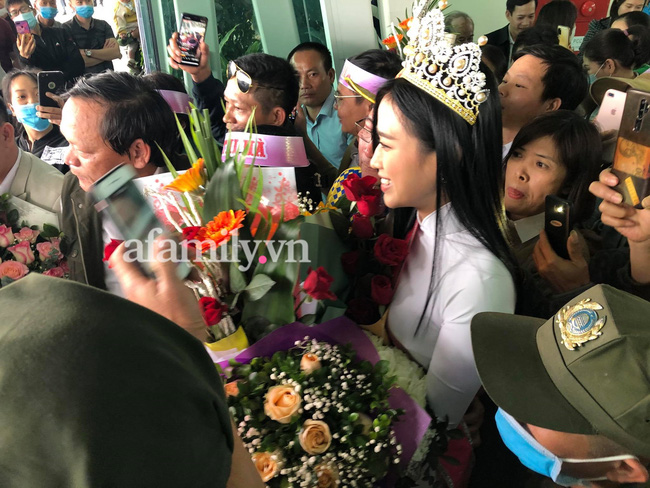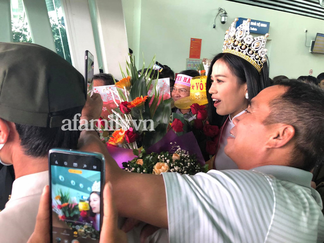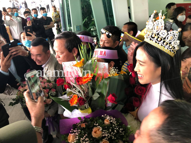 Ngay khi vừa xuất hiện, Đỗ Thị Hà đã bị vây kín trong rất nhiều người dân đang chờ đón cô ở sân bay. Tân Hoa hậu mặc áo dài trắng, đội vương miện lộng lẫy. Mặc dù chỉ trang điểm nhẹ nhàng nhưng trông Đỗ Thị Hà vẫn rất rạng rỡ, tươi tắn, xinh đẹp.