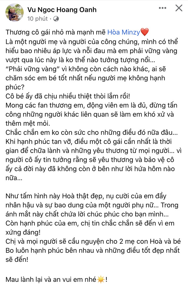 MC Hoàng Oanh còn động viện Hoà Minzy vì thông tin ly hôn. Chính những câu nói quá xúc động của cô nên netizen càng thêm nghi ngờ