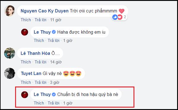 Phía dưới phần bình luận, tấm ảnh của Lê Thúy nhận được rất nhiều lời khen ngợi của đồng nghiệp. Hoa hậu Kỳ Duyên thốt lên: "Trời ơi cực phẩm". Chân dài Tuyết Lan cũng tỏ thái độ ngỡ ngàng trước sự thay đổi của đàn em trong nghề.