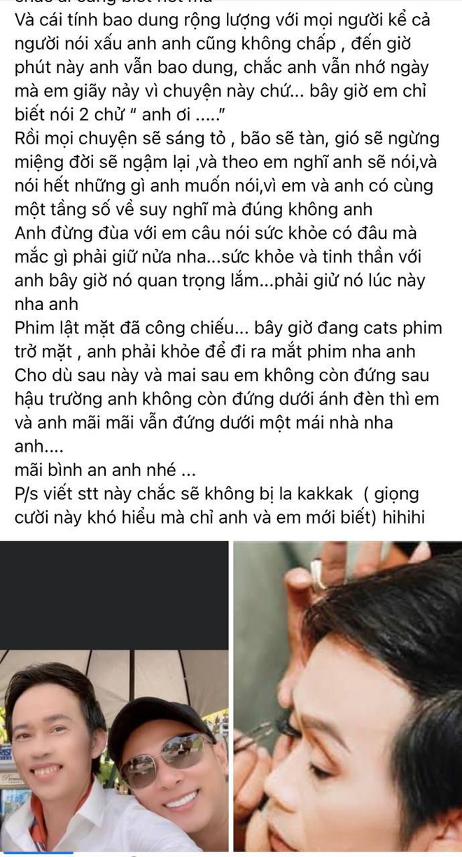 Trong tâm thư gửi NS Hoài Linh, chuyên gia make up này cũng hé lộ lời dặn dò của nam danh hài sau khi vướng loạt thị phi: "Rồi anh có chuyện em là người lên tiếng thì anh lại bảo em im lặng và nhẫn nhịn khi đối mặt với thị phi và miệng đời. Cho đến tận bây giờ và ngay lúc này em cũng không được nói bất cứ thứ gì mà anh đang gánh chịu, em chỉ cầu mong sức khỏe anh bình an".