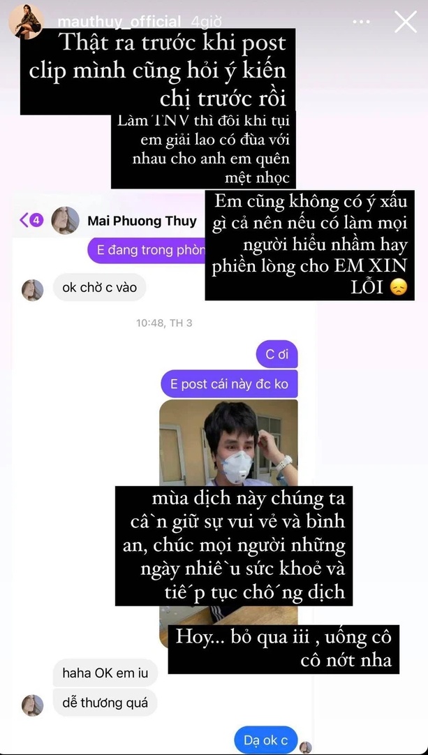 Cùng với đó, người đẹp sinh năm 1992 tiết lộ luôn tin nhắn đã xin phép Mai Phương Thúy trước khi đăng tải đoạn clip gây xôn xao dư luận lên mạng xã hội. Hành động này đã xóa tan nghi ngờ của nhiều người về việc Hoa hậu Việt Nam 2006 bị tổn thương bởi hành động kém duyên của đàn em.