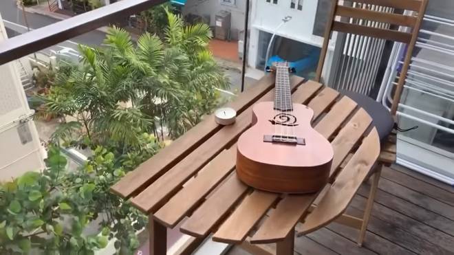 "Tối tối, tôi và chồng thường ra ban công tâm sự, đốt nến lên và đàn ukulele thật lãng mạn. Không gian ở đây rất thoáng mãn, yên tĩnh. Tôi cũng thường ngồi ngoài ban công để hóng gió".