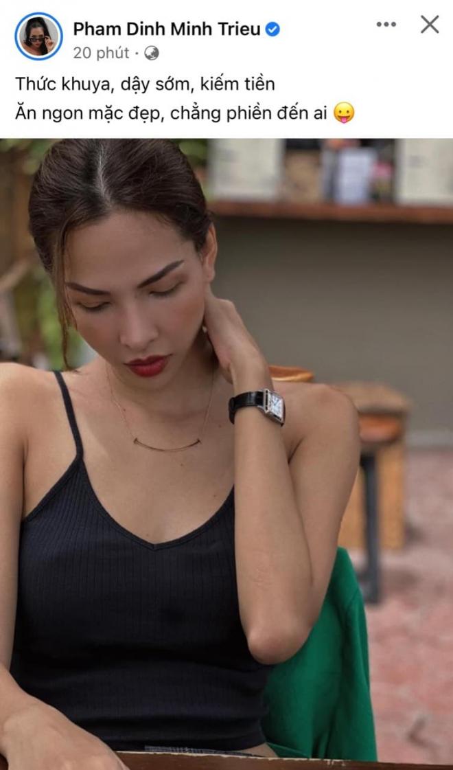 Sau nghi vấn công khai tình mới thì mới đây, trên trang Facebook cá nhân, Minh Triệu đã bất ngờ đăng tải hình ảnh khoe nhan sắc vô cùng xinh đẹp, thần thái nức nở. Tuy nhiên, đáng chú ý lại chính là dòng trạng thái như ẩn ý chuyện độc thân: 'Thức khuya, dậy sớm, kiếm tiền. Ăn ngon mặc đẹp, chẳng phiền đến ai'.