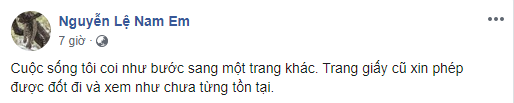 Cách đây vài giờ, Nam Em bất ngờ chia sẻ lên trang cá nhân dòng trạng thái buồn bã: "Cuộc sống tôi coi như bước sang một trang khác. Trang giấy cũ xin phép được đốt đi và xem như chưa từng tồn tại".