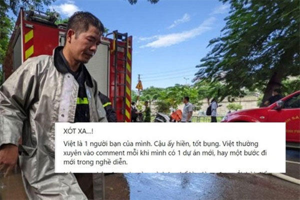 Diễn viên Việt Hoàng, bạn thân của chiến sĩ Việt vừa hy sinh có chia sẻ xúc động trên trang cá nhân ngay khi hay tin dữ. "Xót xa! Việt là 1 người bạn của mình. Cậu ấy hiền, tốt bụng. Việt thường xuyên vào comment mỗi khi mình có 1 dự án mới hay một bước đi mới trong nghề diễn. Hôm nay nhận được tin này, mình không thể kìm lòng được. Ở thời điểm quay phim Lửa ấm, mình đóng vai 1 cậu lính PCCC trẻ, bản thân mình đã lấy Việt - 1 người bạn duy nhất làm chữa cháy để hình dung về vai diễn. Ngược lại, cậu ấy theo dõi rất tường tận bộ phim khi ấy mình đóng, comment không xót 1 bài nào liên quan đến nghề nghiệp của cậu ấy".