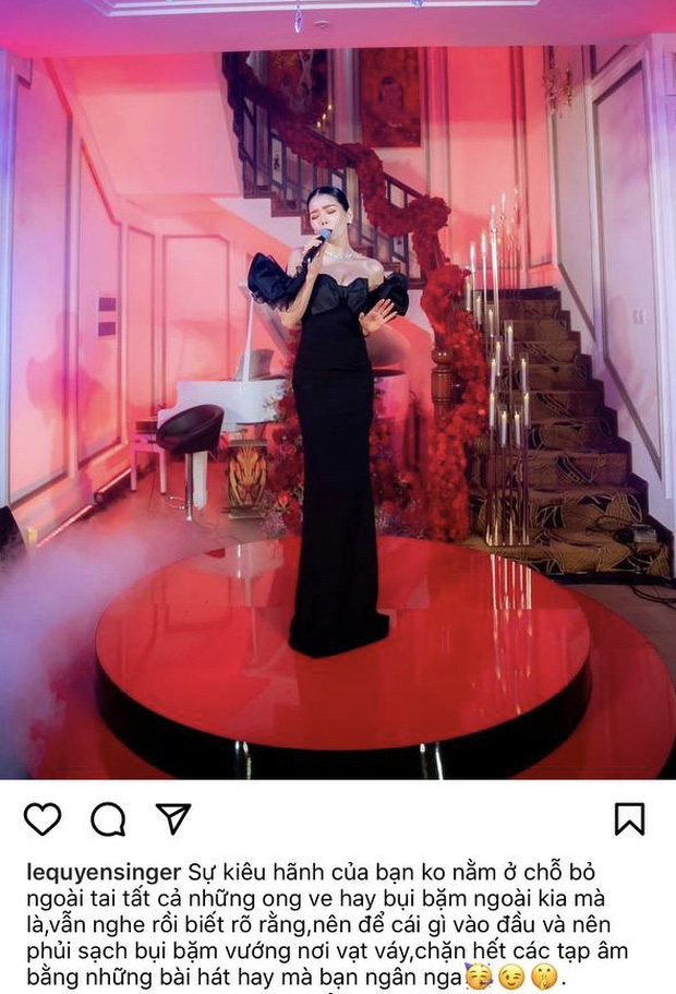 Chiều 25/1, dân tình xôn xao trước bài đăng triết lí của nữ ca sĩ Lệ Quyên chia sẻ trên Instagram cá nhân. "Sự kiêu hãnh của bạn không nằm ở chỗ bỏ ngoài tai tất cả những bụi bặm ngoài kia, mà là vẫn nghe rồi biết rõ ràng, nên để cái gì vào đầu và nên phủi sạch bụi bặm vướng nơi vạt váy, chặn hết các tạp âm bằng những bài hát hay mà bạn ngân nga", Lệ Quyên chia sẻ. Nhiều người cho rằng nữ ca sĩ đang ngầm phủ nhận tin đồn trục trặc tình cảm với bạn trai và ẩn ý không quan tâm tới lùm xùm.