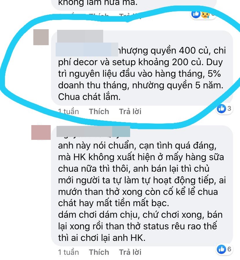 Dưới bài đăng của Huy Khánh, một số cư dân mạng lại bình luận chê trách anh. Nhiều người cho rằng Huy Khánh không nên lên mạng than thở, kể lể chuyện mất tiền bạc vì thua lỗ là chuyện bình thường trong kinh doanh và dù sao anh cũng đã bán lại cửa hàng này cho người khác.