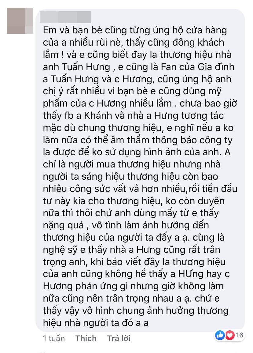 Bên cạnh đó, cũng có khán giả không đồng tình với cách xử sự của Huy Khánh vì làm ảnh hưởng đến thương hiệu của vợ chồng Tuấn Hưng. “Em nghĩ nếu anh không làm nữa có thể âm thầm thông báo công ty là được, để không sử dụng hình ảnh của anh. Anh chỉ là người mua thương hiệu còn người ta sáng lập ra thương hiệu, còn bao nhiêu công sức vất vả hơn nhiều… Anh dùng mấy từ em thấy nặng quá, vô tình làm ảnh hưởng thương hiệu người ta đấy anh ạ. Cùng là nghệ sĩ em thấy nhà anh Hưng cũng rất trân trọng anh”, cư dân mạng bày tỏ quan điểm.