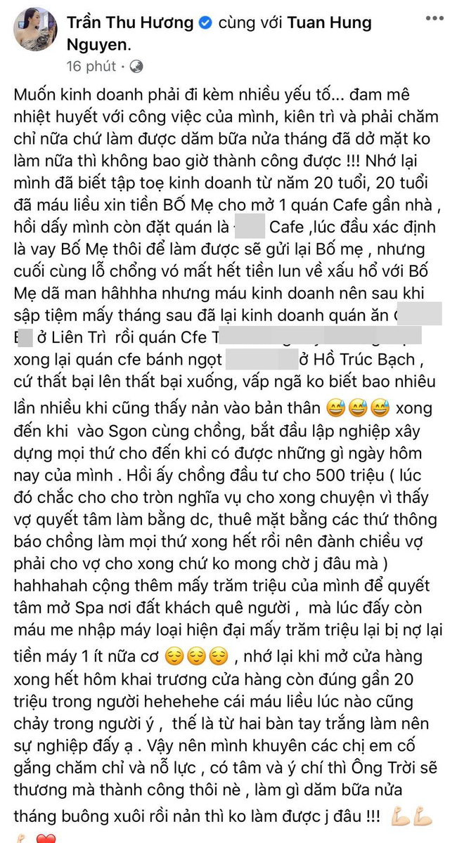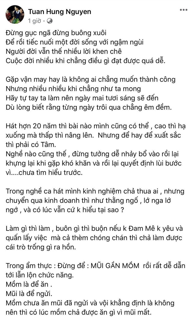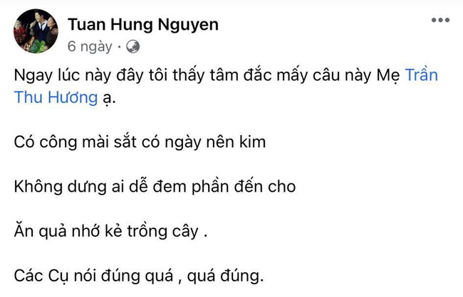Trong khi đó, bà xã Thu Hương của nam ca sĩ cũng ẩn ý: “Cố gắng chăm chỉ và nỗ lực, có tâm và ý chí thì ông trời sẽ thương mà cho thành công thôi, dăm bữa nửa tháng buông xuôi rồi nản thì không làm được gì đâu”.