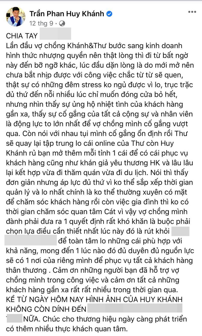 Tuy nhiên mới đây Huy Khánh lại tuyên bố mình không còn liên quan đến thương hiệu nhượng quyền từ nhà Tuấn Hưng