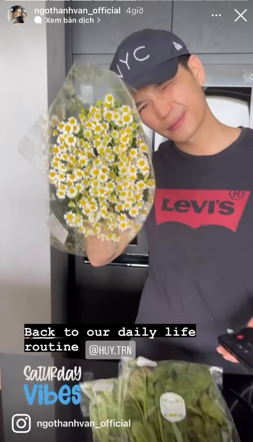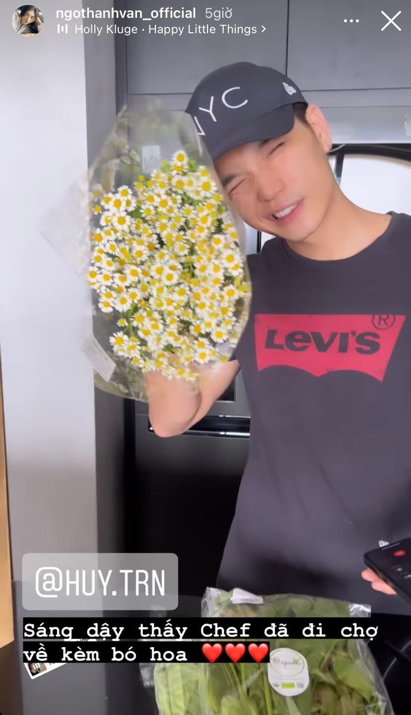 Sáng sớm ngủ dậy, Ngô Thanh Vân đã vô cùng bất ngờ khi thấy ông xã đi chợ mua thực phẩm về nấu ăn cho mình. Huy Trần còn không quên mua một bó hoa xinh xắn để tặng bà xã. Hành động lãng mạn của Huy Trần không chỉ khiến Ngô Thanh Vân cảm động mà ai cũng ngưỡng mộ cuộc sống hạnh phúc của "đả nữ" bên chồng kém tuổi.