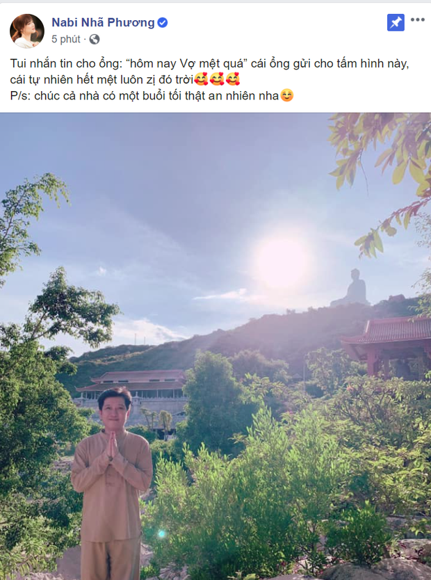 Mới đây, Nhã Phương tiếp tục khiến người hâm mộ "lụi tim" khi tiết lộ đoạn hội thoại với Trường Giang. Cụ thể, nữ diễn viên Tuổi Thanh Xuân dường như đã trải qua một ngày khá mệt mỏi nên quyết định nhắn tin "làm nũng" với chồng: "Hôm nay vợ mệt quá". Cứ tưởng chỉ nhận được câu an ủi vu vơ nhưng không, ngay khi nghe tin Trường Giang đã quyết định gửi bức hình đang đi chùa cầu nguyện qua, như muốn nhắn nhủ rằng "Ngoài kia nếu có khó khăn quá, hãy nhớ luôn có anh kề bên, cầu nguyện cho em". Có thể nói, hành động này của Trường Giang đã khiến Nhã Phương cảm động vô cùng. Có ông xã ngọt ngào lại tâm lý thế này thì ai mà chẳng thích cơ chứ!