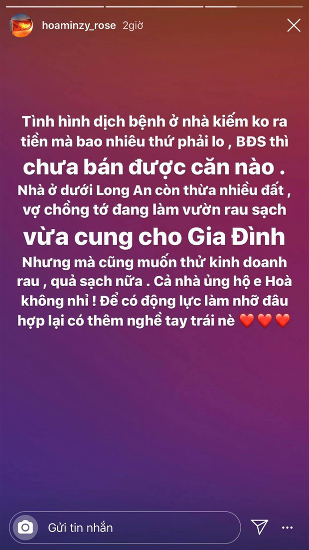 Trước đó, Hòa Minzy cũng chia sẻ về việc kết hôn và có con khi xuất hiện tại một sự kiện: "Em luôn luôn có mong muốn nuôi em trai ăn học, công việc xong xuôi mới nghĩ đến việc kết hôn. Kết hôn với em cũng không quan trọng bằng việc mình sống cùng người mình yêu và hạnh phúc thế nào. Với cả em cũng phải có hai đứa em mới kết hôn".
