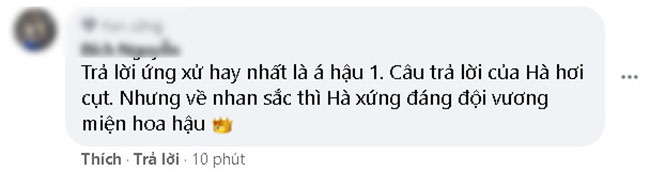 Tuy chưa trọn vẹn nhưng nói chung câu trả lời ngắn gọn, đủ ý và nêu bật được quyết tâm của Đỗ Thị Hà. Hầu hết dân mạng đều cho rằng nếu ở hoàn cảnh của Đỗ Thị Hà, mới 19 tuổi đã phải tham gia cuộc thi lớn như vậy, bình tĩnh được từ đầu đến cuối cuộc thi thì đáng nể quá nhưng ít người làm được ắm. Ngay cả khi đã được công bố là Hoa hậu Việt Nam 2020, thời điểm MC Danh Tùng mời Đỗ Thị Hà ngồi lên chiếc ghế quyền lực, cô còn "đơ" ra một lúc rồi mới phản ứng kịp thời.