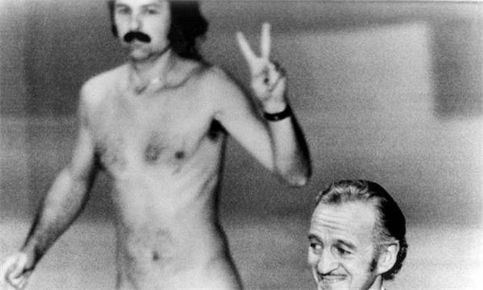 Bằng cách nào đó, nhà hoạt động xã hội Robert Opel - người không có tên trong danh sách được mời - đã lẻn vào hậu trường và chạy thẳng lên sân khấu trong tình trạng khỏa thân. Ông còn rất tỉnh khi giơ tay ký hiệu “V” (Victory = Chiến thắng). Sự việc xảy ra vào năm 1974 được liệt vào danh sách những hình ảnh đáng chôn vùi trong lịch sử Oscar. Ảnh: Vogue.