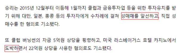 Bài báo chỉ rõ Seungri bị truy tố vì môi giới mại dâm và đánh bạc