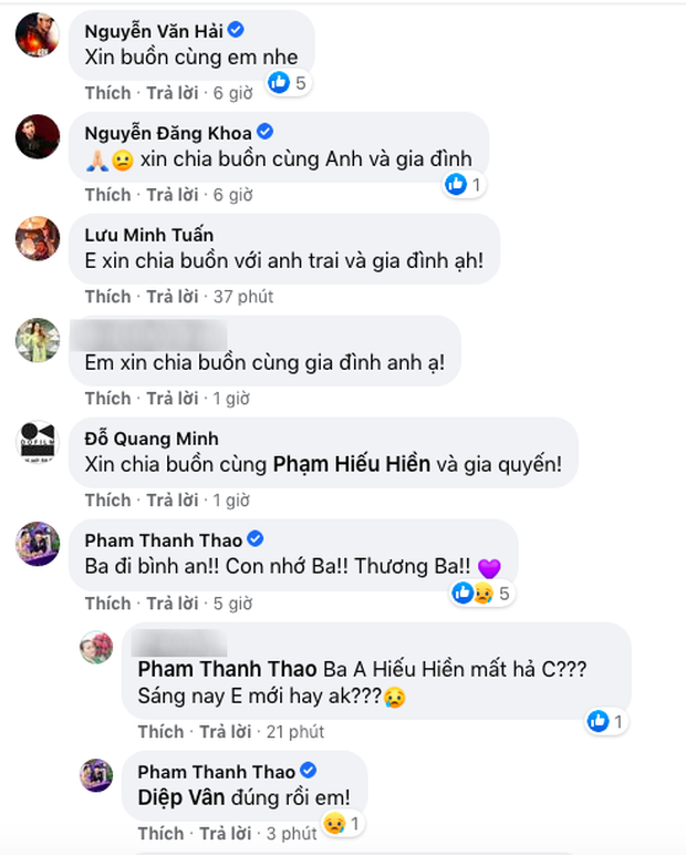 Trên Facebook giờ đây, anh chị em nghệ sĩ cũng như khán giả đều thương tiếc gửi đến Hiếu Hiền lời chia buồn. Là một tiền bối thân thiết, NS Cát Phượng xót xa thốt lên: "Chia buồn cùng em Hiếu Hiền! Ba cũng đi theo mẹ rồi. Chị chia buồn cùng em". Trước đó, mẹ nam diễn viên là cố nghệ sĩ Kim Ngọc đã qua đời vì đột quỵ vào năm 2011.