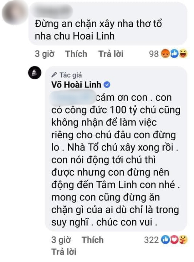 Giữa loạt ồn ào, cư dân mạng cũng rầm rộ "đào" lại màn đáp trả của nam NS Hoài Linh khi bị 1 khán giả tố ăn chặn vào năm 2020. Theo đó, 1 tài khoản Facebook bình luận với hàm ý mỉa mai: "Đừng ăn chặn xây nhà thờ Tổ nha chú Hoài Linh". Trước tình huống này, NS Hoài Linh lại rất bình tĩnh đáp lại: "Cảm ơn con, con có công đức 100 tỉ chú cũng không nhận để làm việc riêng cho chú đâu, con đừng lo. Nhà Tổ chú xây xong rồi, con nói động tới chú thì được nhưng con đừng nên động tới tâm linh con nhé. Mong con cũng đừng ăn chặn gì của ai dù chỉ là trong suy nghĩ, chúc con vui".