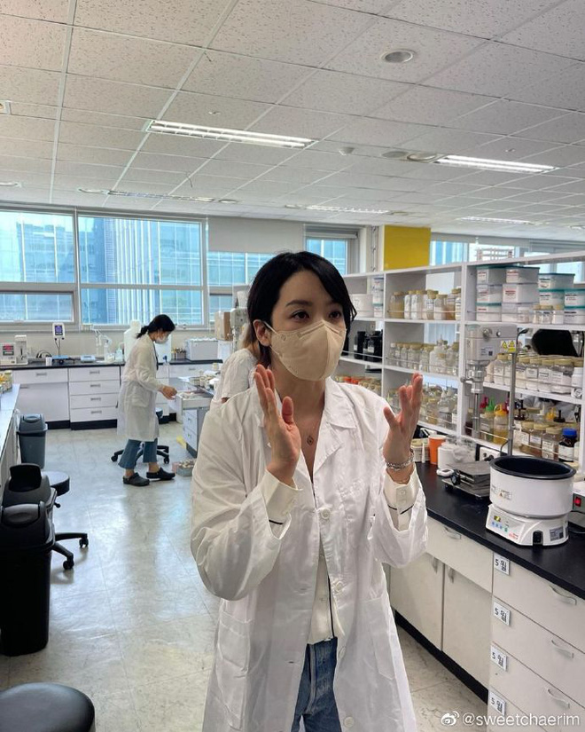 Chae Rim xuất hiện với trang phục áo khoác trắng đồng phục thường dùng ở phòng thí nghiệm.