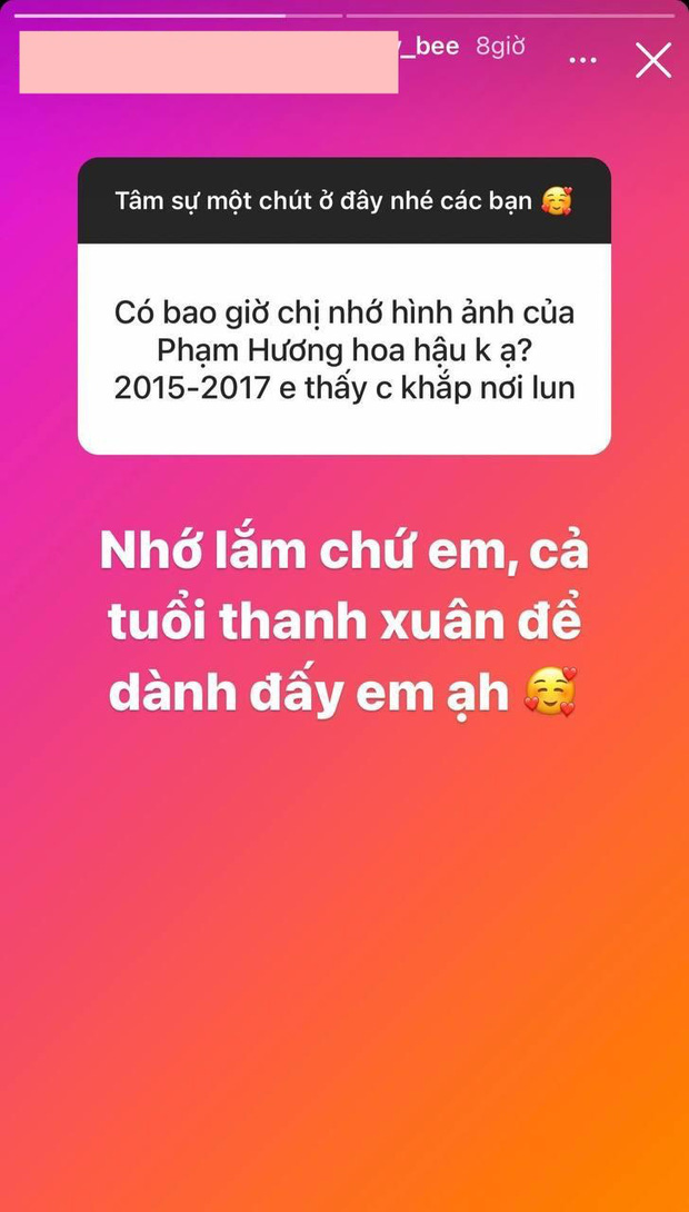Mới đây, khi được fan nhắc về thời hoàng kim, nàng hậu bất ngờ chia sẻ: "Nhớ chứ em, cả tuổi thanh xuân để dành đấy". Dù không còn hoạt động nghệ thuật sôi nổi nhưng những ngày qua Phạm Hương thường xuyên gửi lời nhắn, động viên đến các chiến binh Đỗ Hà - Kim Duyên và Thuỳ Tiên bởi hơn ai hết cô hiểu sứ mệnh và trách nhiệm của 1 mỹ nhân đại diện Việt Nam thi đấu nhan sắc. Sau 3 năm vắng bóng, nhiều người hâm mộ vẫn mong chờ 1 ngày Phạm Hương comeback và lợi hại hơn xưa.