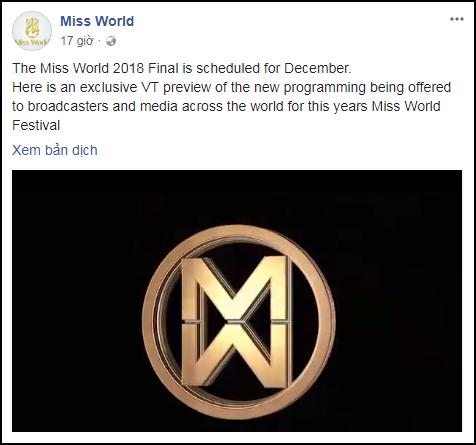 Trang chủ Miss World xác nhận cuộc thi Hoa hậu Thế giới 2018 sẽ diễn ra vào tháng 12/2018. Như vậy, tân Hoa hậu Việt Nam có đầy đủ thời gian để chuẩn bị chinh chiến tại đấu trường này.