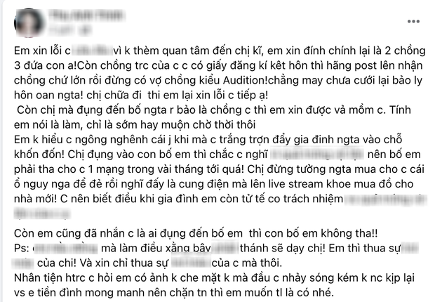 Vài tiếng sau, người này tiếp tục cho đăng tải phần 2 của câu chuyện lên trang cá nhân. Cô đính chính một số thông tin về nữ ca sĩ L.P.A và cho biết: "Em không hiểu chị ngông nghênh cái gì khi mà chị trắng trợn đẩy gia đình người ta vào chỗ khốn đốn! Chị đụng vào con bố em thì chắc chị nghĩ vì *** nên bố em phải tha cho chị 1 mạng trong vài tháng tới quá! Chị đừng tưởng người ta mua cho chị cái ổ nguy nga để đẻ rồi nghĩ đấy là cung điện mà lên livestream khoe mua đồ cho nhà mới! Chị nên biết điều khi gia đình em còn tử tế có trách nhiệm với con của chị ạ".