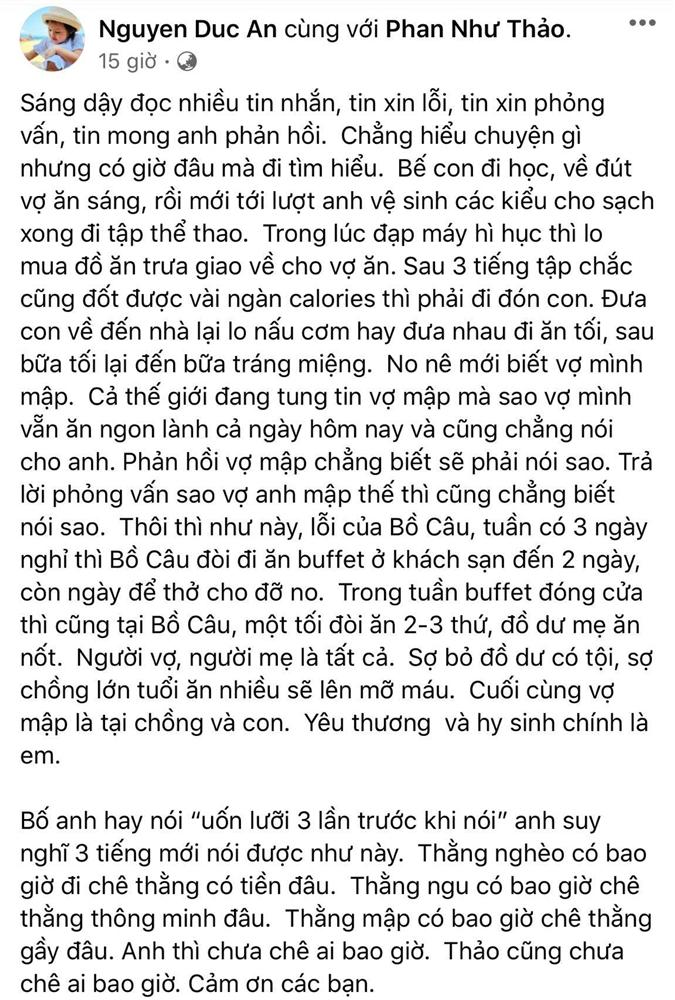 Trên trang cá nhân, đại gia Đức An viết: "Cả thế giới đang tung tin vợ mập mà sao vợ mình vẫn ăn ngon lành cả ngày hôm nay và cũng chẳng nói cho anh. Phản hồi vợ mập chẳng biết sẽ phải nói sao. Trả lời phỏng vấn sao vợ anh mập thế thì cũng chẳng biết nói sao. Thôi thì như này, lỗi của Bồ Câu, tuần có 3 ngày nghỉ thì Bồ Câu đòi đi ăn buffet ở khách sạn đến 2 ngày, còn ngày để thở cho đỡ no. Trong tuần buffet đóng cửa thì cũng tại Bồ Câu, một tối đòi ăn 2-3 thứ, đồ dư mẹ ăn nốt. Người vợ, người mẹ là tất cả. Sợ bỏ đồ dư có tội, sợ chồng lớn tuổi ăn nhiều sẽ lên mỡ máu. Cuối cùng vợ mập là tại chồng và con. Yêu thương và hy sinh chính là em".
