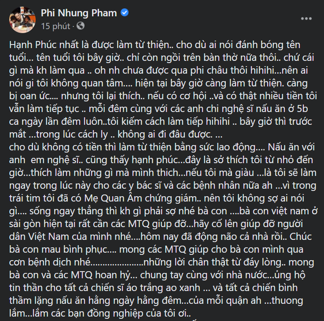 Ngày 16/7, Phi Nhung chia sẻ trên trang cá nhân dòng trạng thái khá dài về chuyện cô làm từ thiện. Nữ ca sĩ viết: