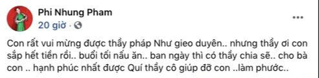 1 tháng hậu drama, mới đây, trên trang cá nhân Phi Nhung gây chú ý khi bất ngờ than đã... "hết tiền". Theo đó, cô viết những lời cảm ơn một người thầy và bày tỏ nỗi lòng như sau: "Con rất vui mừng được thầy Pháp Như gieo duyên nhưng thầy ơi con sắp hết tiền rồi. Buổi tối nấu ăn, ban ngày thì có thầy chia sẻ cho bà con, hạnh phúc nhất được quý thầy cô giúp đỡ con, làm phước".