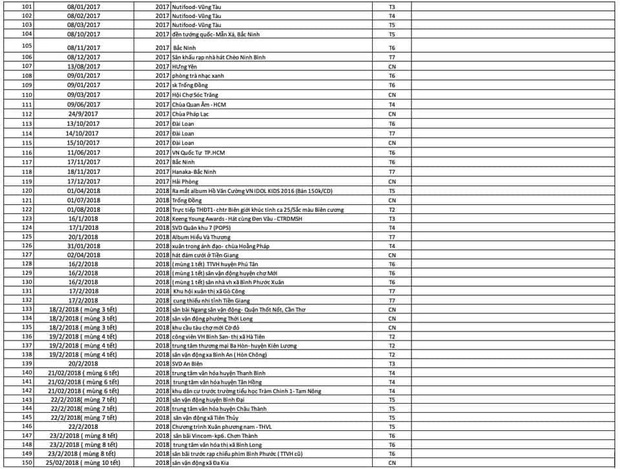 Danh sách này được cho là 310 buổi diễn, sự kiện mà Hồ Văn Cường tham gia suốt 5 năm qua