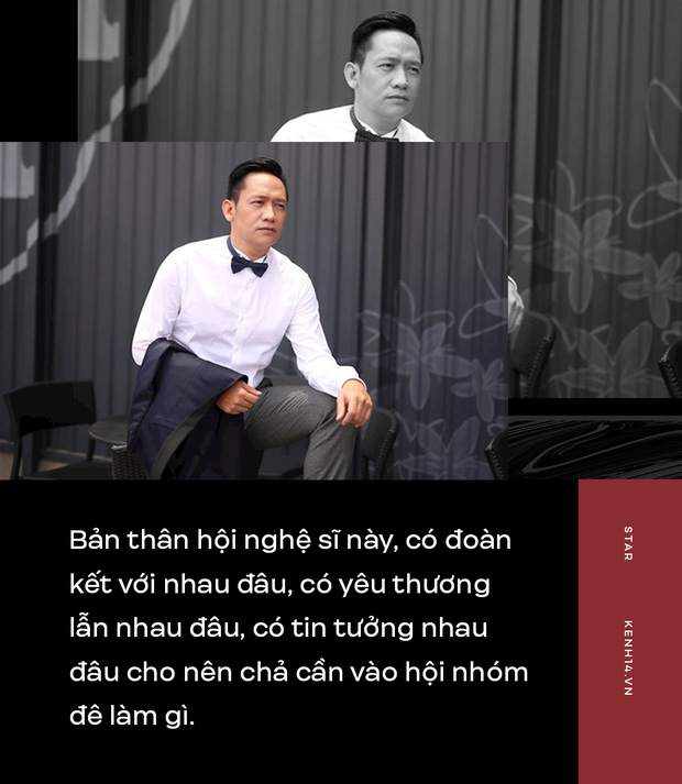 Tôi chỉ đưa quan điểm thôi, tôi càng không thích lập hội nhóm vì tôi nghĩ, bản thân hội nghệ sĩ này có đoàn kết với nhau đâu, có yêu thương lẫn nhau đâu, có tin tưởng nhau đâu cho nên chẳng cần vào hội nhóm để làm gì. Còn chuyện group chat thì tôi cũng không biết trong đó có những người nào, vừa vào tôi đã thoát ra ngay.