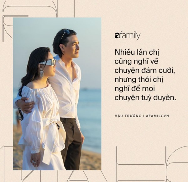 "Nhiều lần chị cũng nghĩ về chuyện đám cưới, nhưng thôi chị nghĩ để mọi chuyện tuỳ duyên (cười). Chị thì cũng không sao nhưng nghĩ tới anh Ngoan nhiều khi anh ấy cũng tủi thân. Có lần cũng nghĩ về 1 đám cưới ở nước ngoài, mời những người bạn cực kỳ thân thiết với mình, tổ chức tiệc nhỏ xinh. Nhưng trở ngại lớn nhất có lẽ từ phía chị, chị không muốn mẹ mình có những xáo trộn trong cuộc sống", chị chia sẻ.