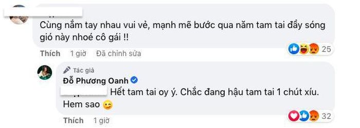Đồng thời, khi nhận được bình luận của fan động viên rằng: "Cùng nắm tay nhau vui vẻ, mạnh mẽ bước qua năm tam tai đầy sóng gió này nhé cô gái", Phương Oanh cũng vui vẻ đáp lại: "Hết tam tai rồi ý. Chắc đang hậu tam tai 1 chút xíu. Hem sao".