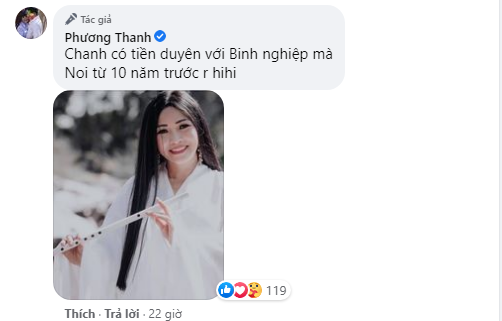 Dưới phần bình luận, Phương Thanh còn tiết lộ thêm: "Chanh có tiền duyên với binh nghiệp mà, nói từ 10 năm trước rồi". Chia sẻ của nữ ca sĩ khiến cộng đồng mạng đoán rằng "bạn trai tin đồn" kém 21 tuổi của Phương Thanh là một quân nhân.