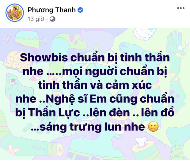 Suối thời gian vừa qua, cõi mạng rần rần xôn xao vì loạt ồn ào sao kê từ thiện và lùm xùm đời tư của các nghệ sĩ tên tuổi trong showbiz Việt. Giữa thời điểm nóng, Phương Thanh bất ngờ đăng tải một status gây chú ý: "Showbiz chuẩn bị tinh thần nhé. Mọi người chuẩn bị tinh thần và cảm xúc nhé. Nghệ sĩ em cũng chuẩn bị thần lực, lên đèn, lên đồ sáng trưng luôn nhé".
