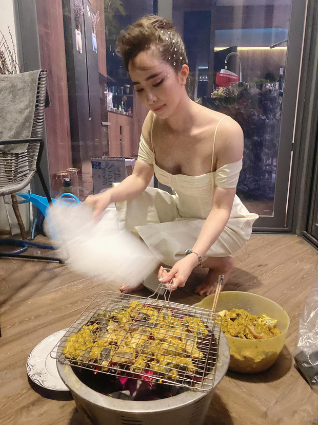 Chiều ngày 5/2, Quỳnh Nga khiến dân tình chú ý khi tung clip lên đồ lồng lộn chỉ để đi... nướng chả cá. "Đính hột cho lồng lộn xong ra quạt chả cá thế này thôi cả nhà ạ. Thời trang vào bếp hơi tốn thời gian nhỉ? Theo mọi người mai thì layout gì cho lạ?", Quỳnh Nga viết.