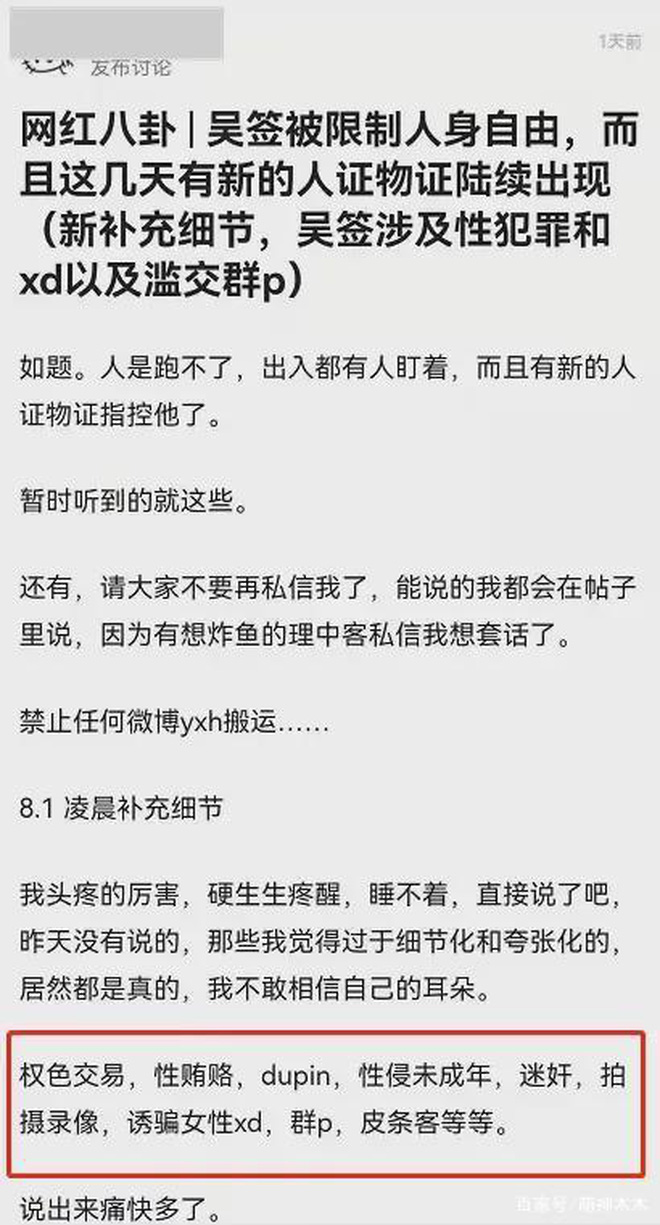 Trang BJH sáng ngày 1/8 xuất hiện bài viết chia sẻ về việc 1 blogger trên Douban đã đưa ra danh sách phạm tội của Ngô Diệc Phàm. Nếu như cảnh sát mới chỉ tuyên bố bắt giữ cựu thành viên EXO vì tội hiếp dâm thì nay, danh sách này còn khiến người hâm mộ sốc hơn nhiều.