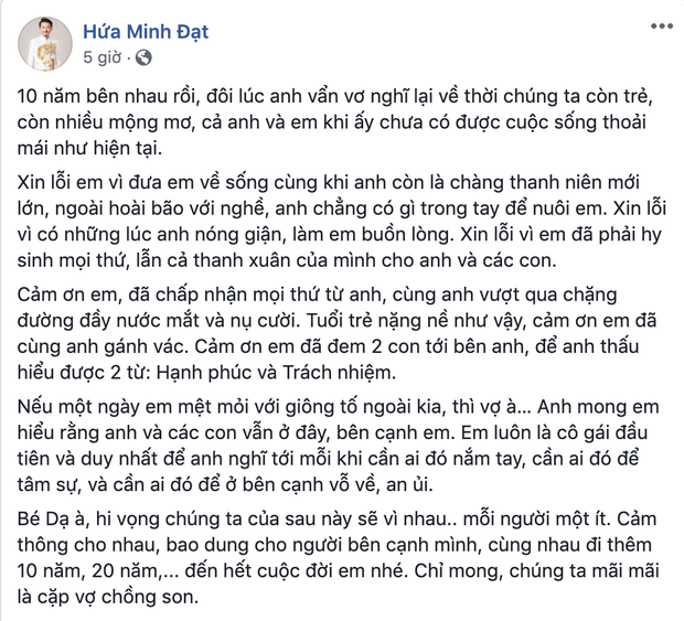 Hẳn ai cũng mong muốn có một tình yêu đẹp như Hứa Minh Đạt và bà xã. Bình yên bên nhau, lúc khó khăn hàn vi đến lúc hạnh phúc đủ đầy hiện tại. Cũng nhân dịp này, nam danh hài gửi lời xin lỗi đến Lâm Vỹ Dạ: "Xin lỗi em vì đưa em về sống cùng khi anh còn là chàng thanh niên mới lớn, ngoài hoài bão với nghề, anh chẳng có gì trong tay để nuôi em. Xin lỗi vì có những lúc anh nóng giận, làm em buồn lòng. Xin lỗi vì em đã phải hy sinh mọi thứ, lẫn cả thanh xuân của mình cho anh và các con."