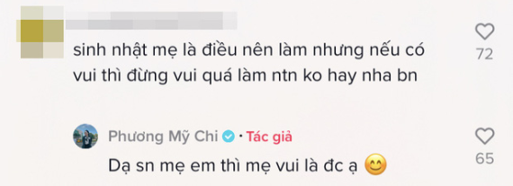 Bên cạnh đó, Phương Mỹ Chi cũng đã có lời phản hồi khi được khuyên không nên làm hành đồng đó. Nữ ca sĩ trả lời: "Dạ sinh nhật mẹ em thì mẹ vui là được ạ".