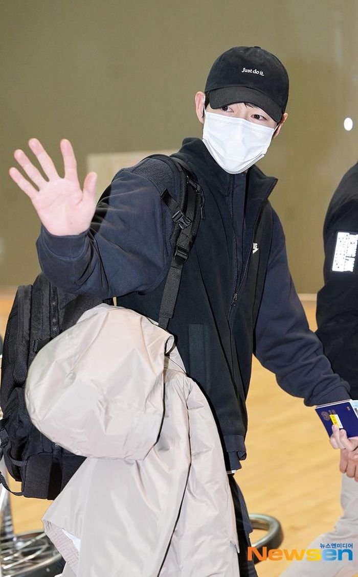 Theo tờ Osen, khi di chuyển tới sảnh khởi hành, Song Joong Ki và vợ cảm ơn khán giả, truyền thông vì được chúc mừng đám cưới. Nam diễn viên vui vẻ vẫy tay, thậm chí làm hành động hi-five với truyền thông. Ảnh: Newsen, TVDaily.