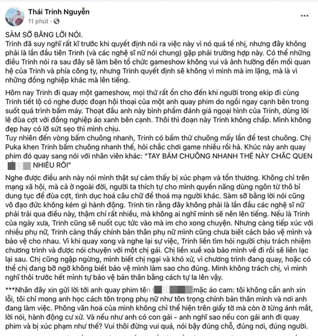 Vào trưa ngày 22/3, Thái Trinh đăng tâm thư dài đầy bức xúc lên trang Facebook cá nhân để nói về việc cô bị sàm sỡ bằng lời nói. Nữ ca sĩ cho biết hôm nay mình có lịch trình quay gameshow, mọi thứ rất ổn cho đến khi nhân viên quay phim trong ekip có thái độ đáng lên án trong suốt quá trình bấm máy. "Thoạt đầu anh này bình phẩm đánh giá ngoại hình của Trinh, dùng lời lẽ đùa cợt với đồng nghiệp áo xanh bên cạnh. Thôi thì đoạn này Trinh không chấp. Mình không đẹp hay có lỡ sứt sẹo thì mình chịu".