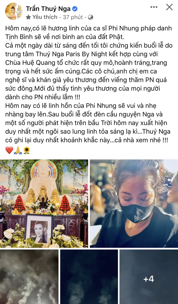 Thuý Nga còn chia sẻ một điểm đặc biệt trên bầu trời trong lễ tang của cố ca sĩ Phi Nhung: "Sau buổi lễ đốt đèn cầu nguyện, Nga và một số người phát hiện trên bầu trời hôm nay xuất hiện duy nhất một ngôi sao lung linh toả sáng lạ kỳ". Sự ra đi của giọng ca Bông Điên Điển để lại nhiều nuối tiếc, hụt hẫng trong lòng người hâm mộ và bạn bè đồng nghiệp.