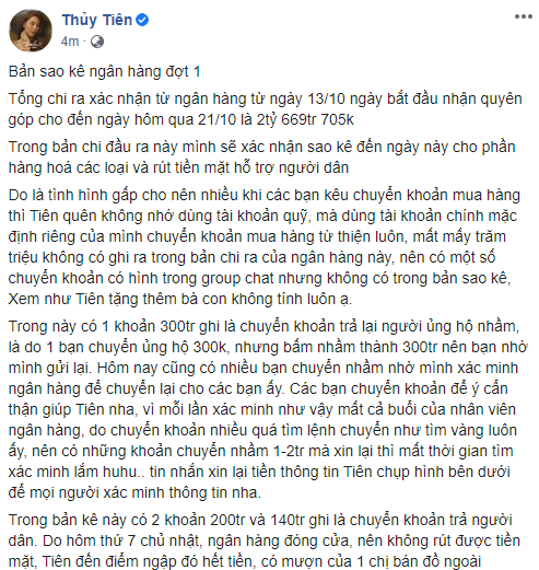 Cụ thể, trên trang cá nhân, Thủy Tiên cho hay, từ ngày 13/10 (thời điểm bắt đầu nhận quyên góp) cho tới ngày hôm qua (21/10), số tiền được rút ra để ủng hộ đồng bào miền Trung là 2 tỷ 669 triệu và 705 nghìn đồng. Đây toàn bộ là sao kê từ ngân hàng trong đợt 1.
