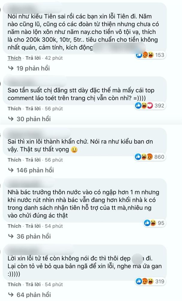 Dù đã xin lỗi trưởng xóm ở thôn Hải Lăng như cộng đồng mạng mong muốn, nhưng Thủy Tiên vẫn khiến người ta không ngừng bàn tán về thái độ của mình. Không ít bình luận chỉ trích, cho rằng bà xã Công Vinh 'xin lỗi cho có', 'khác gì nói cộng đồng mạng và bác trưởng xóm ăn hiếp chị', 'tỏ ra là người bị hại', 'nói như kiểu Tiên sai rồi các bạn xin lỗi Tiên đi'...
