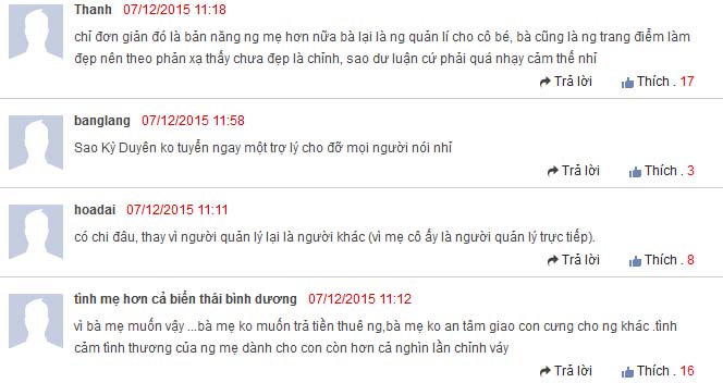 “Bà Thêm hãy nhìn nhận thấu đáo và lui về phía sau để cho con gái trưởng thành. Cô ấy đã là một hoa hậu quốc gia chứ không chỉ còn là con gái của bà mà đi đâu cũng kè kè. Yêu thương cũng phải có cách”, một độc giả bình luận.